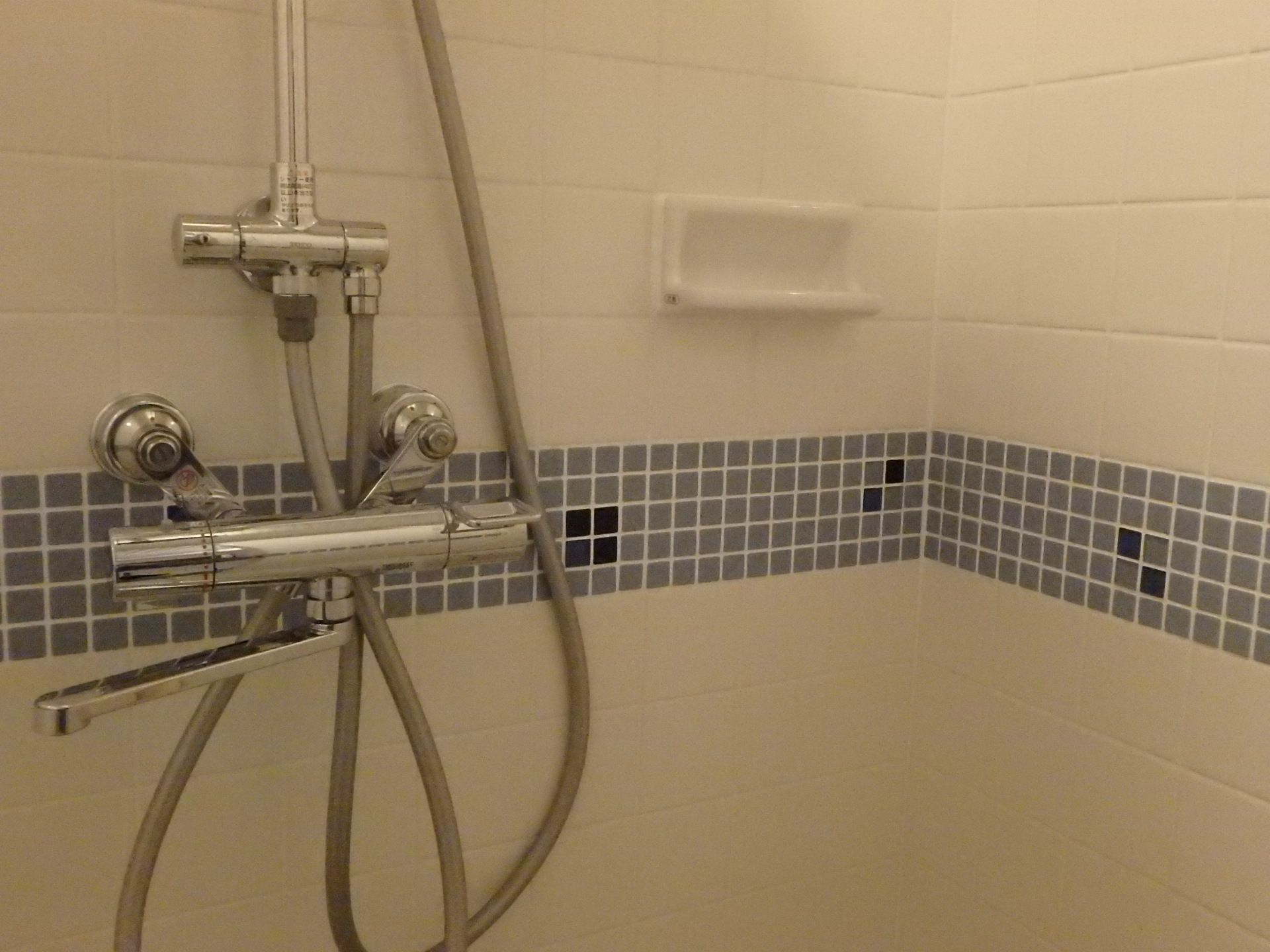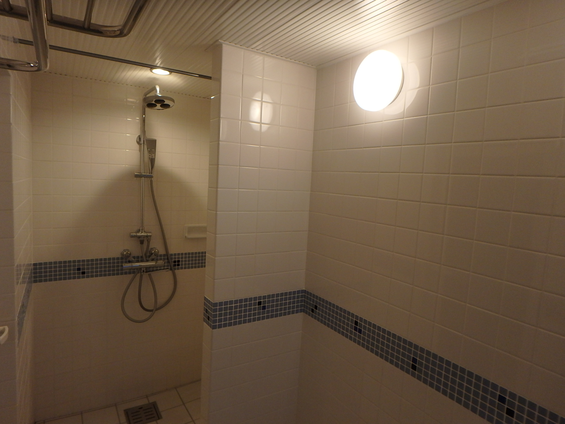 さらに高級ホテルをイメージし、シャワーブースには本格的なオーバーヘッドシャワーを取り付け、石鹸置きも白磁製を使用するなど細部までこだわるとともに、照明についても仕事の疲れなどからの癒しの空間となるよう電球色としています。暖かみのある光が、白いタイルの良く映える仕上がりとなっています。