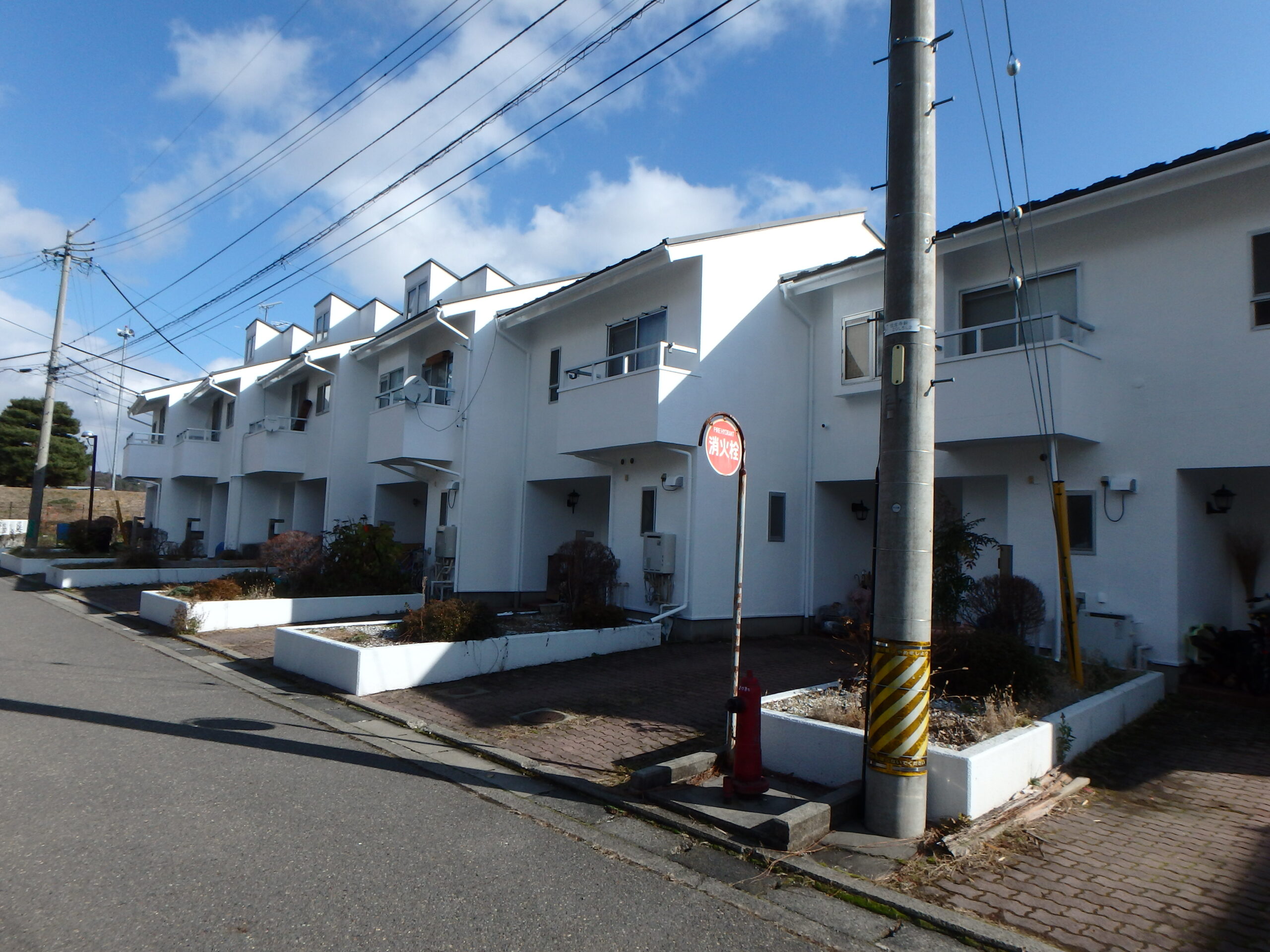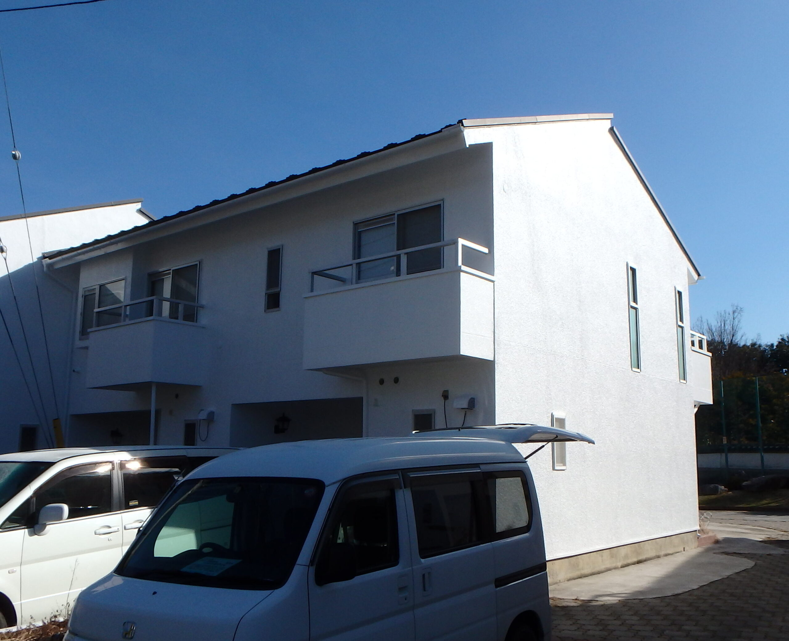 雁行型のモダンな外観の連棟アパートで、今回は白の中でも最も白いスーパーホワイト一色に塗装させていただく計画としました。