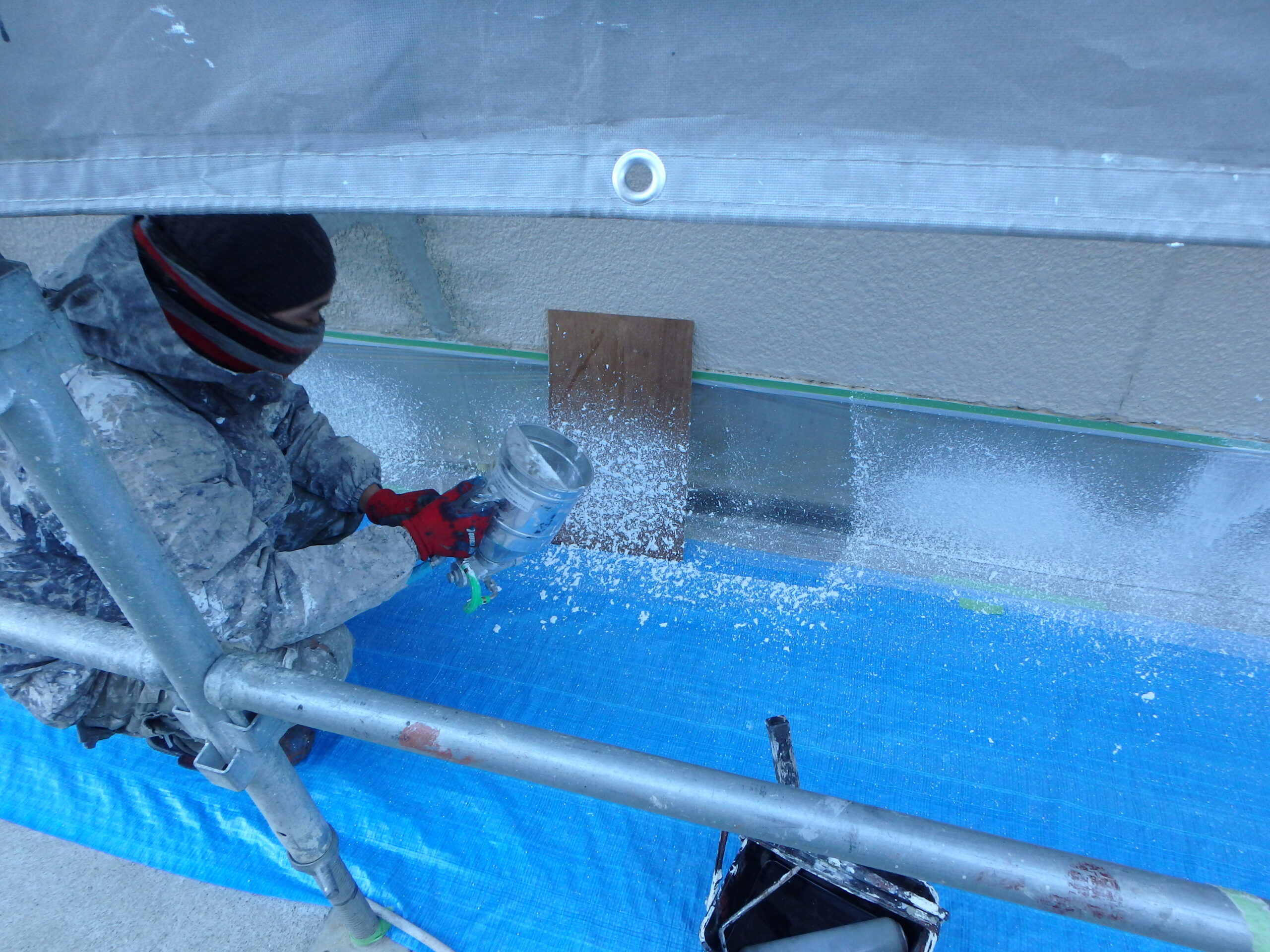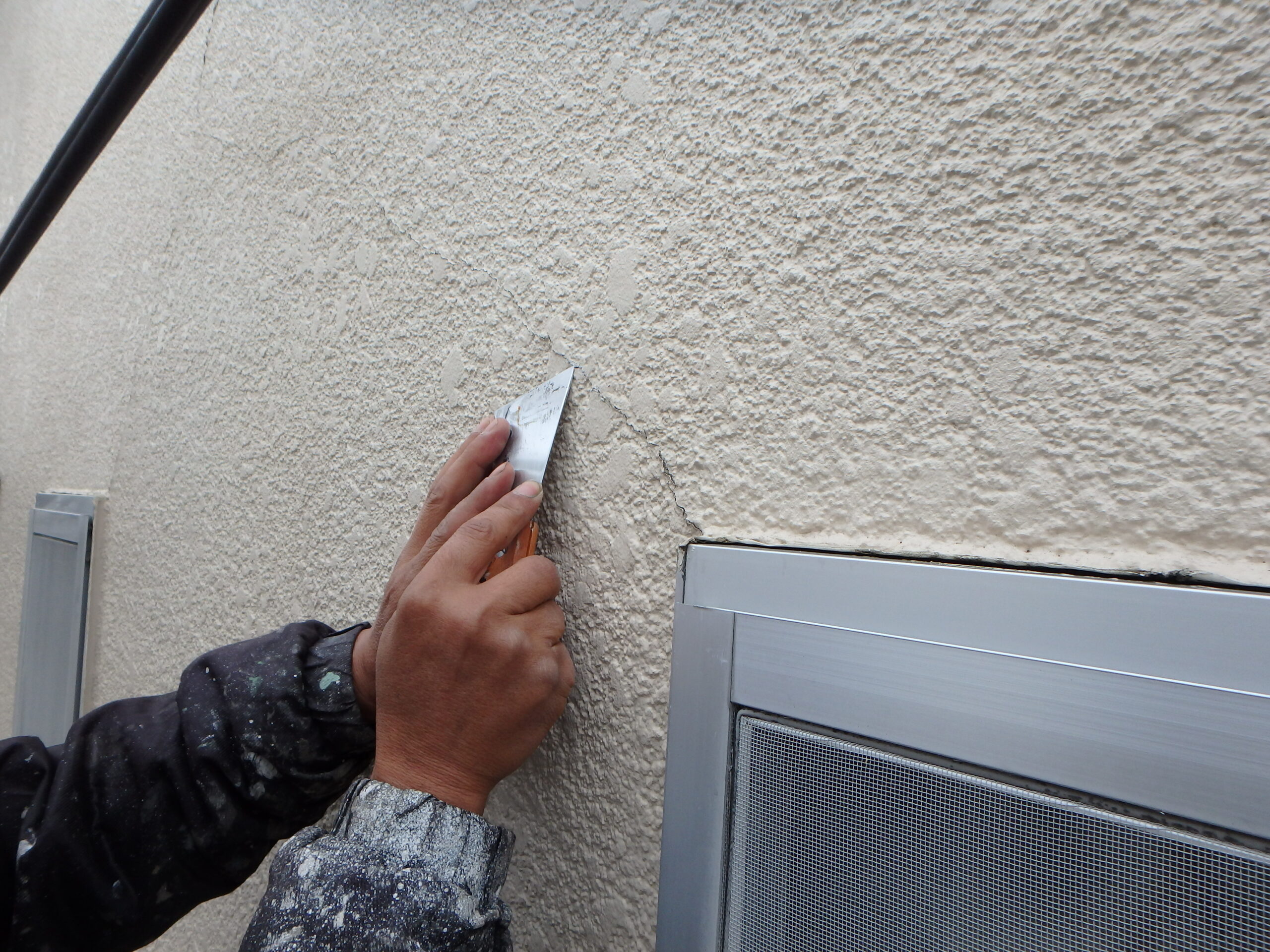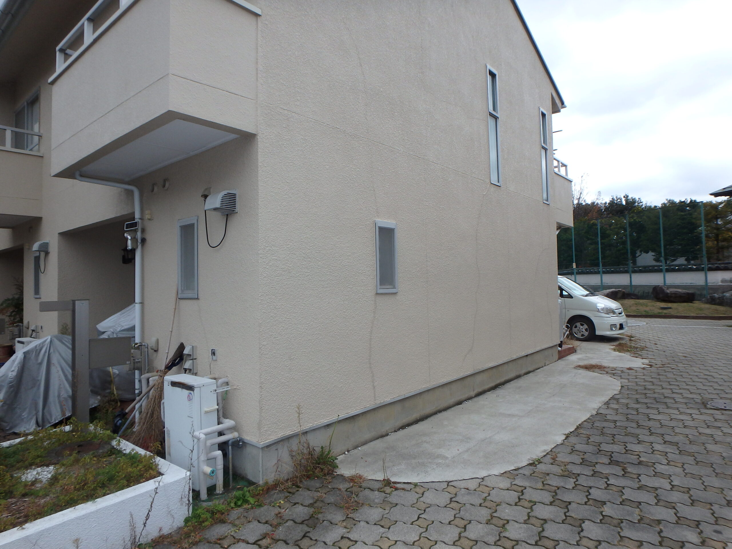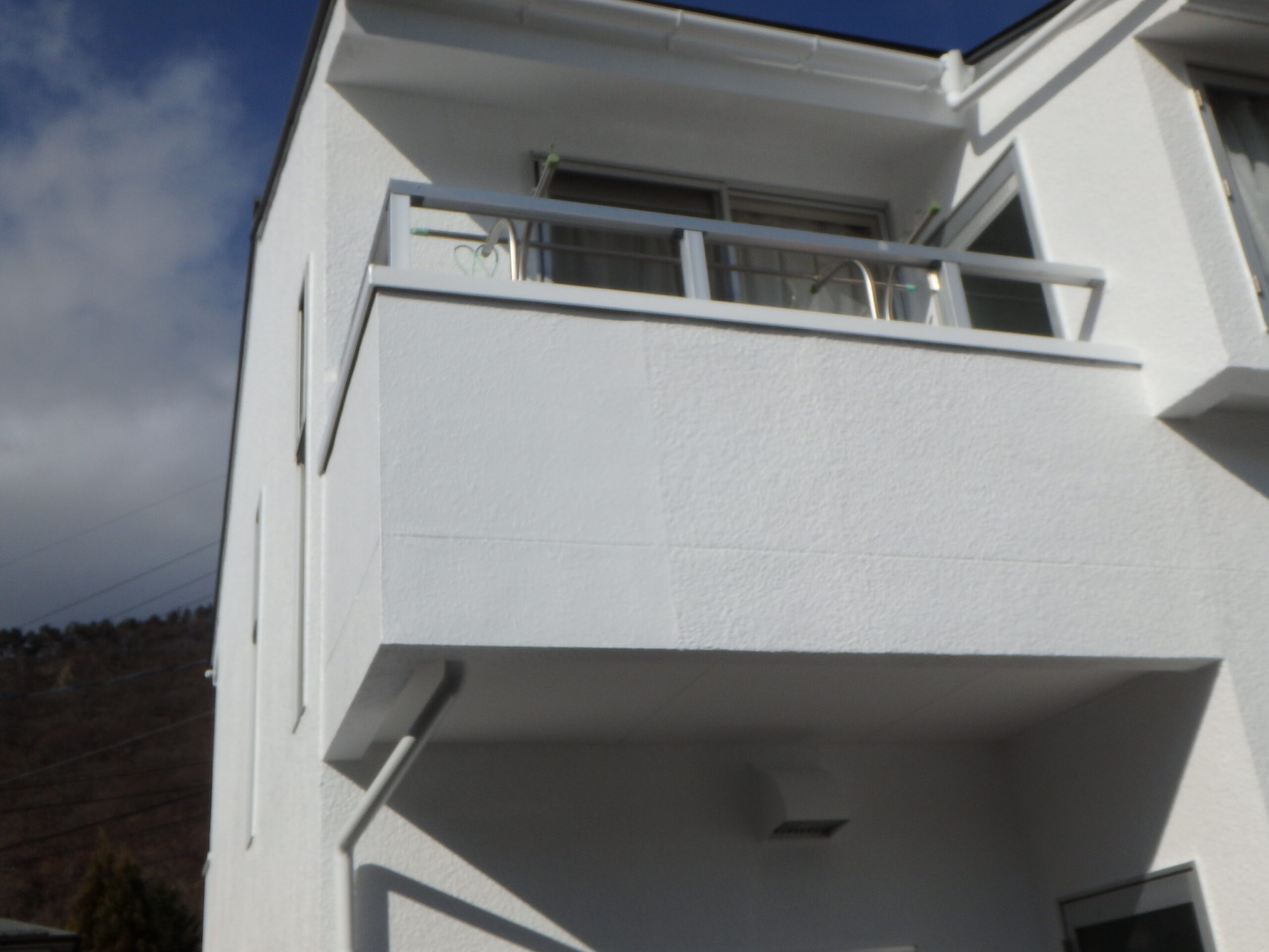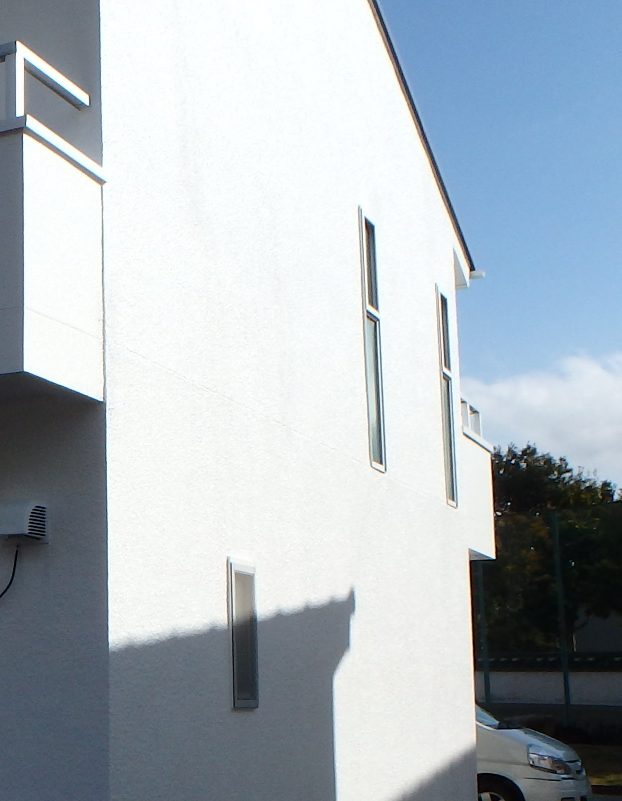 白い外壁は影が生じやすく、一般的には塗り替え塗装に不向きな塗装色になります。今回は特に入念に下地処理や補修を行うことでスーパーホワイト色の塗装を行うことになりました。