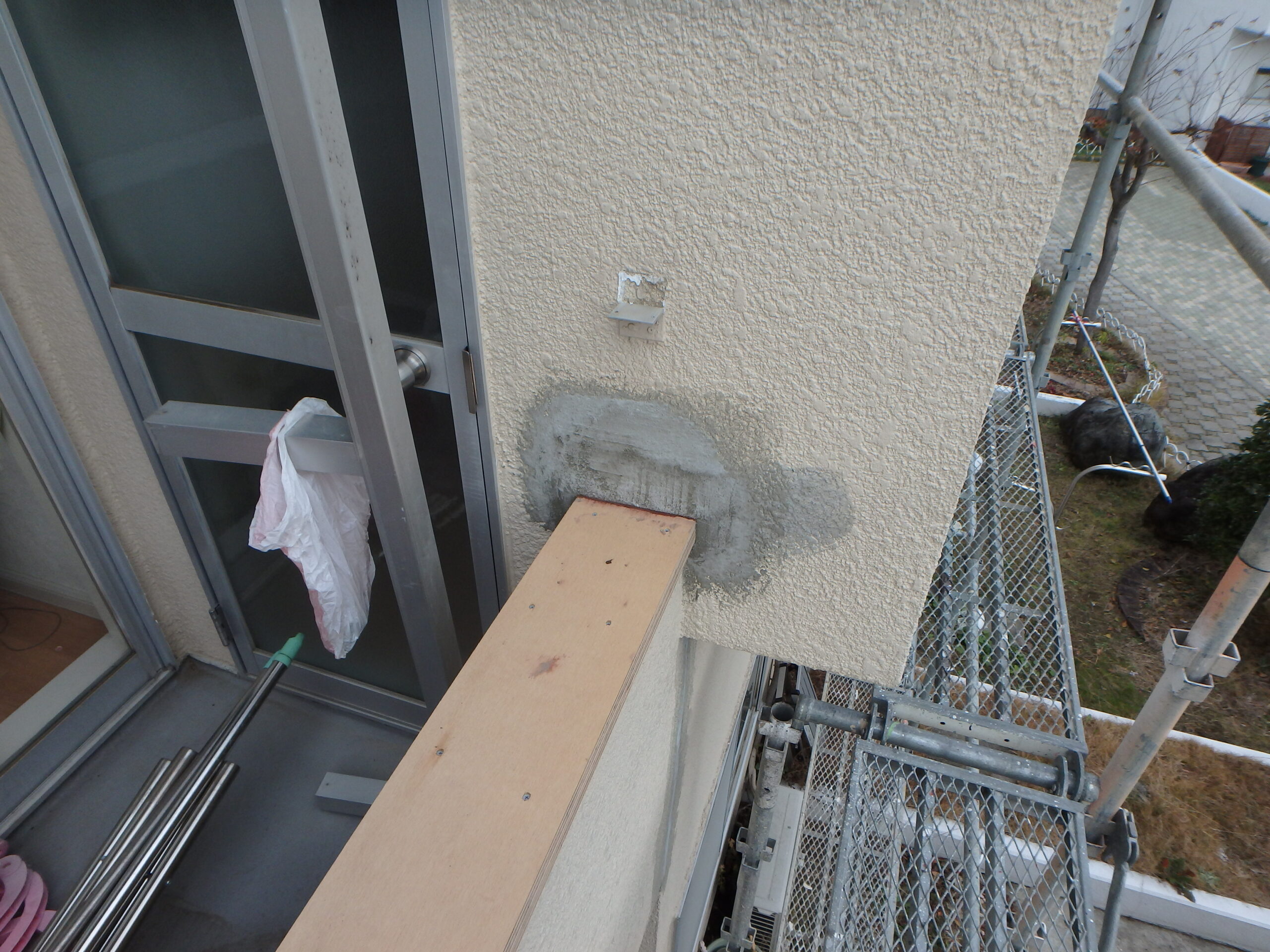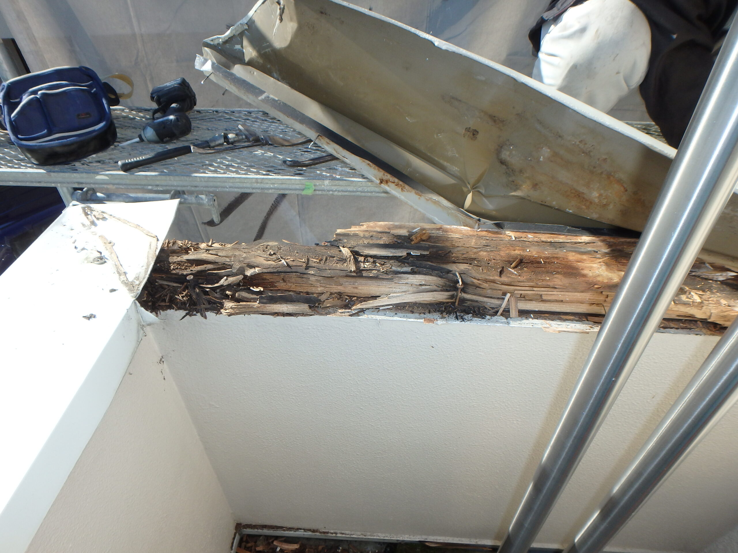 今回は塗装工事のために作業足場を仮設しますので、それに合わせて雨漏りなどで傷んだ外部を確認し、必要に応じて補修を行います。